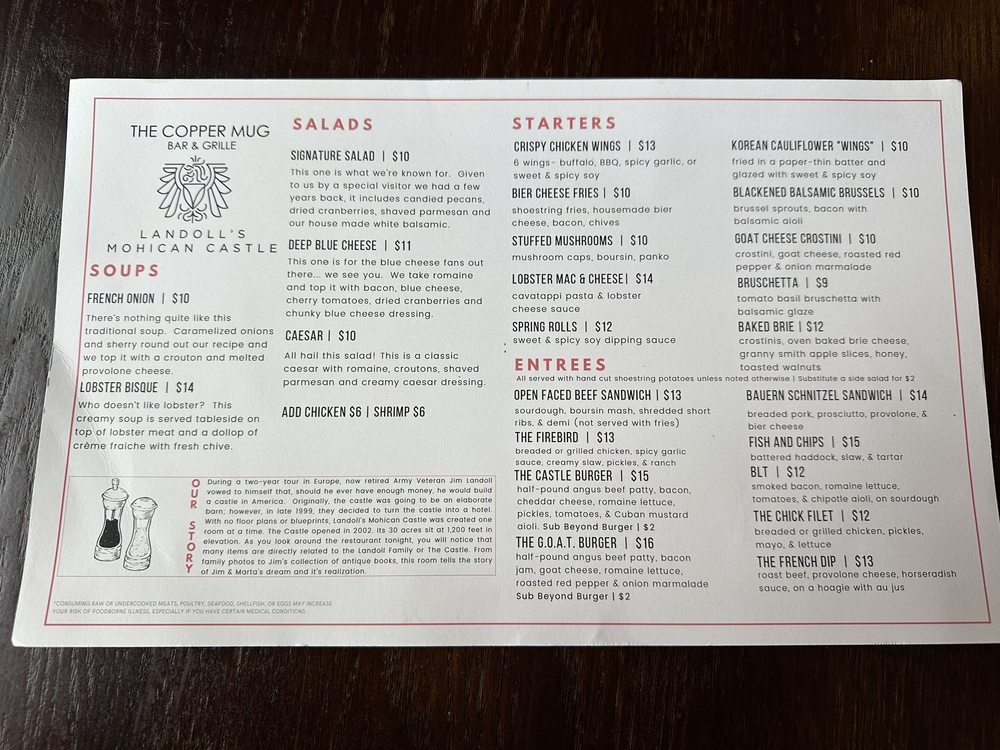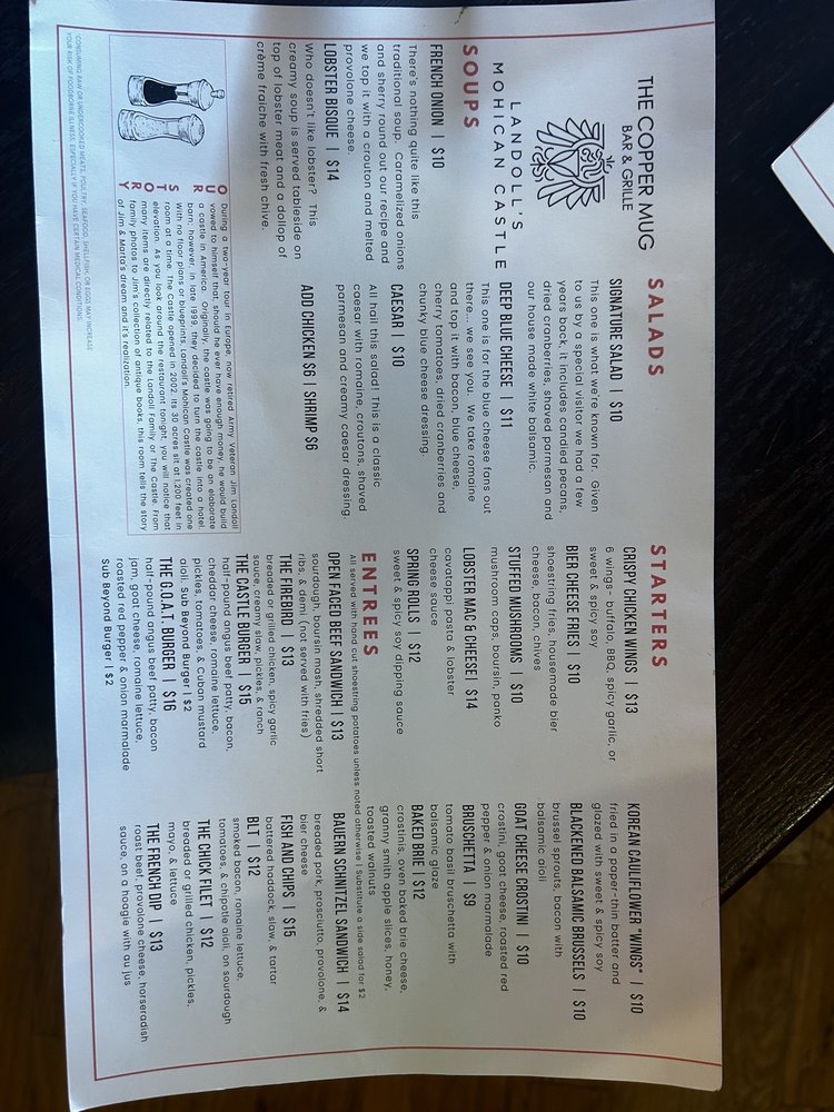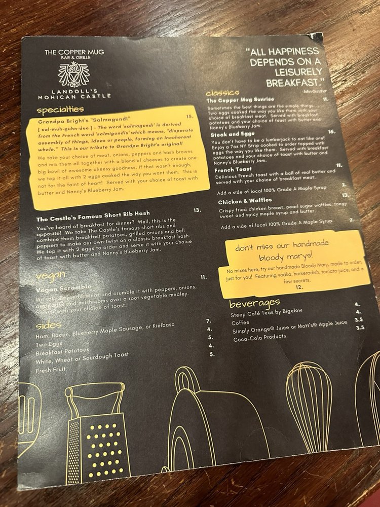 Welcome to Copper Mug Bar And Grille, a culinary gem nestled within the picturesque grounds of Landoll's Mohican Castle in Loudonville, Ohio. This delightful eatery specializes in a fusion of French and American cuisine, offering a breakfast and brunch menu that caters to both casual diners and food enthusiasts alike.